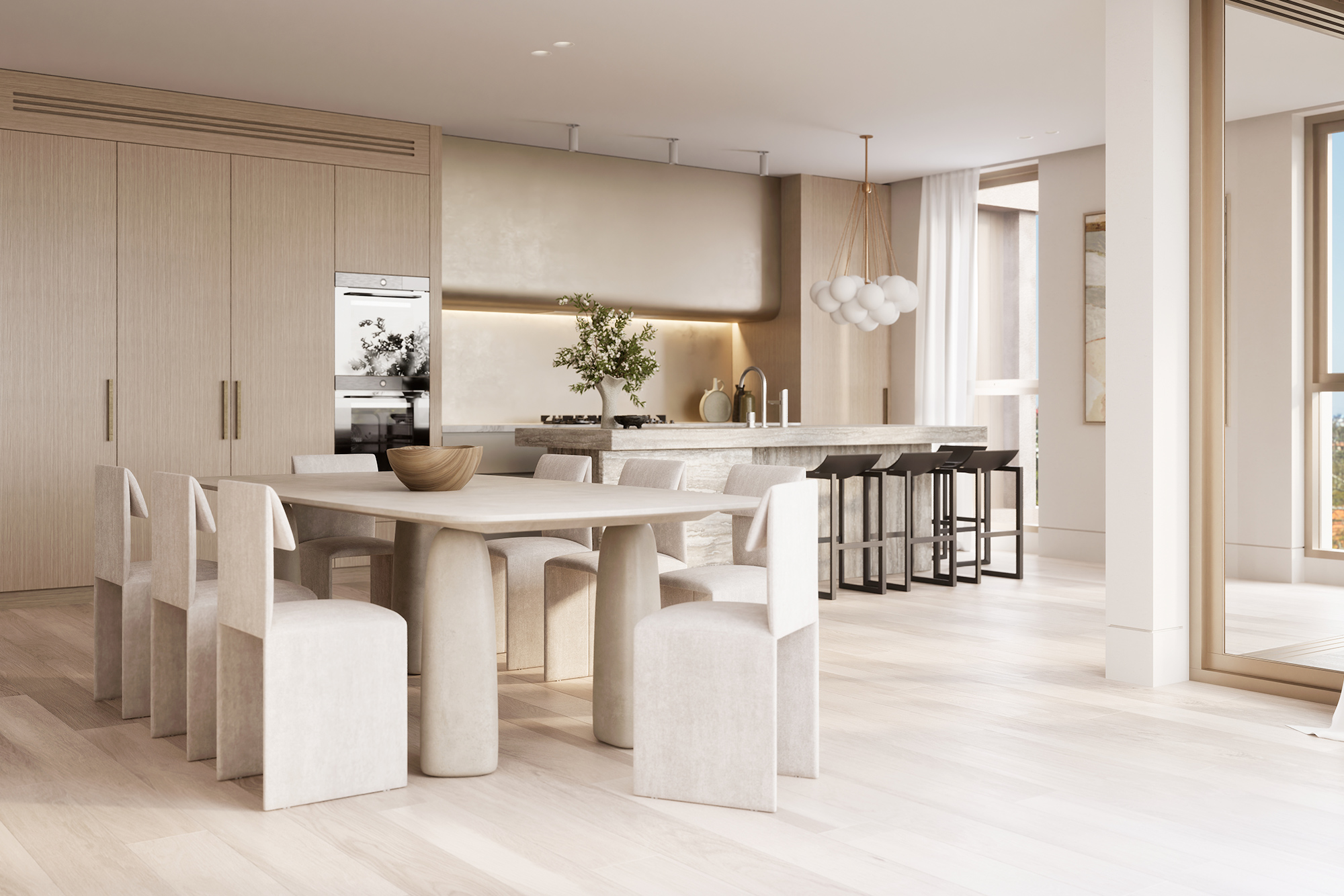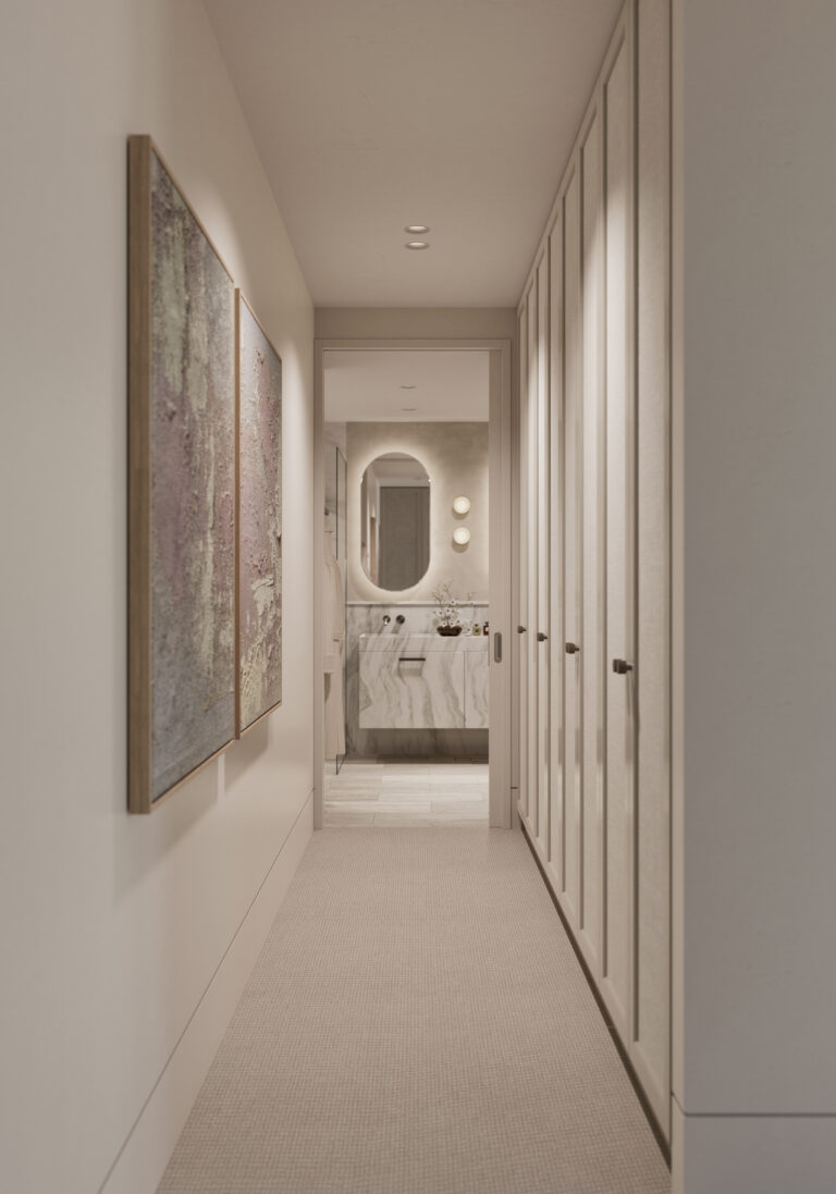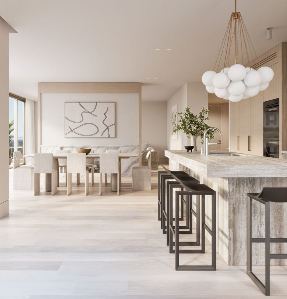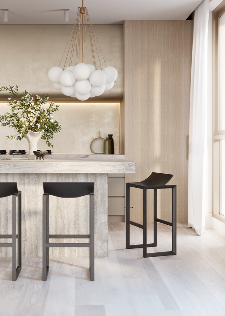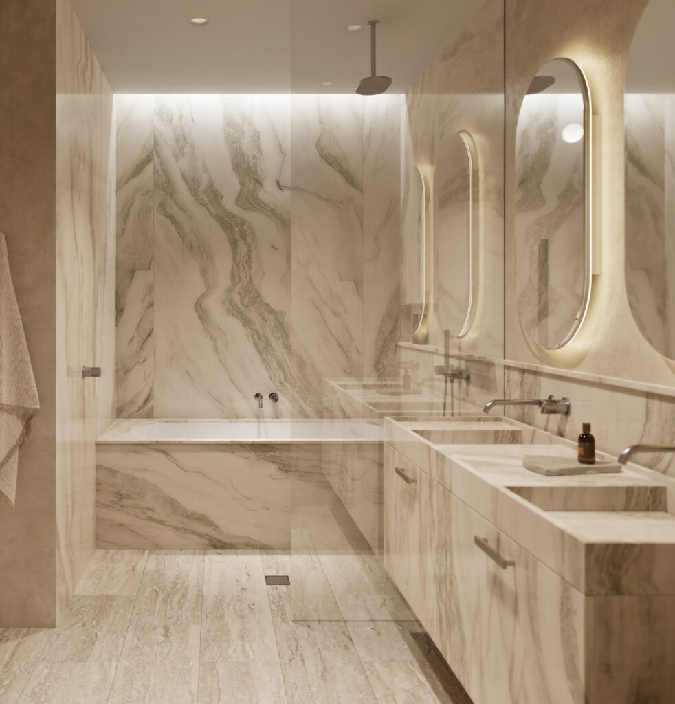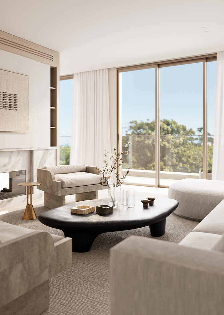 Occupying the entire top floor, the three-bedroom penthouse is a masterpiece of design and scale. Harbour views span Sydney Harbour, the Opera House and Harbour Bridge right across towards Middle Harbour. Generous open plan living and dining spaces feature a stunning double-sided fireplace as the focal point. At the centre of the home, the entertainer’s kitchen is anchored by a natural travertine stone island which flows seamlessly to a 30sqm terrace, capturing the city vistas.