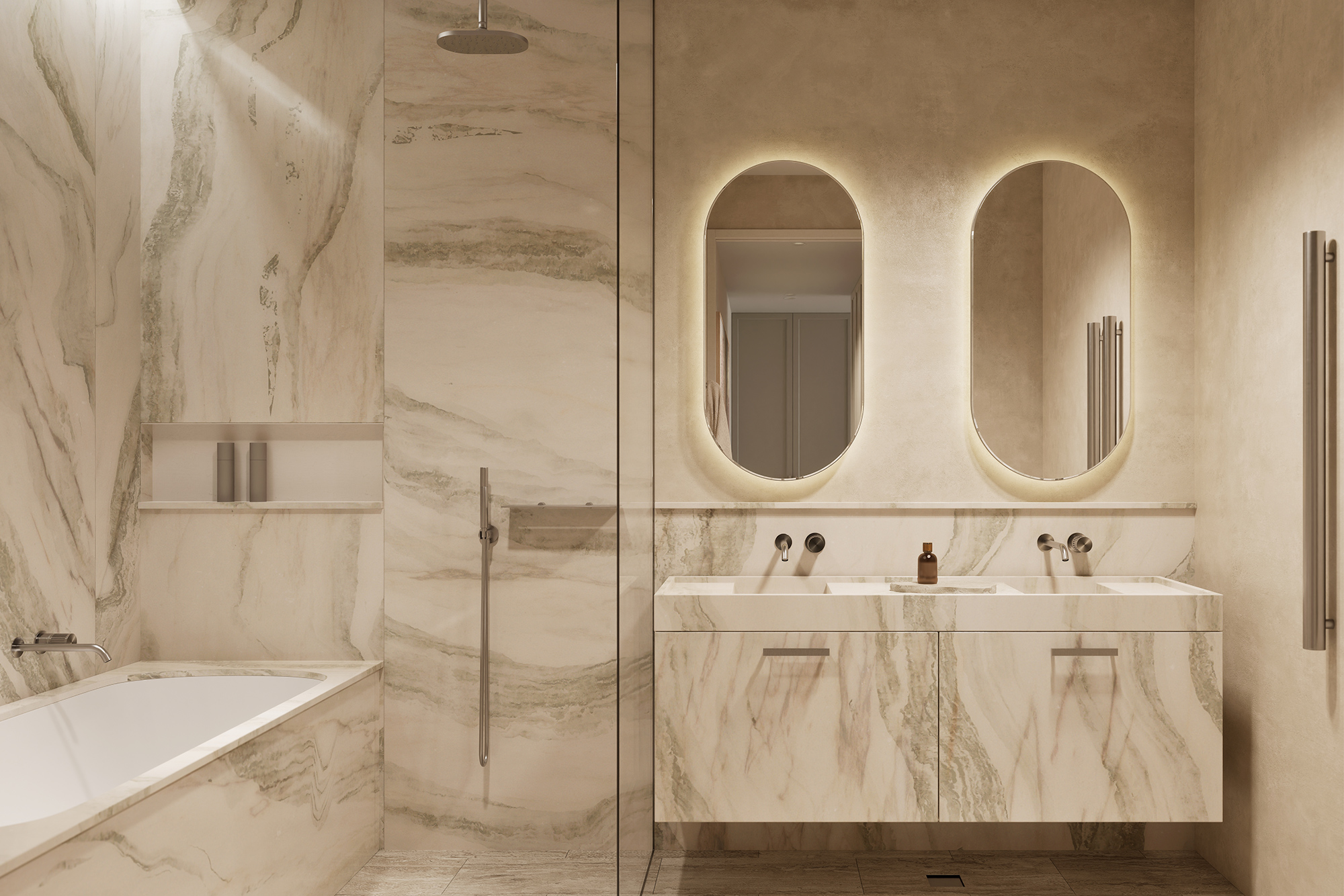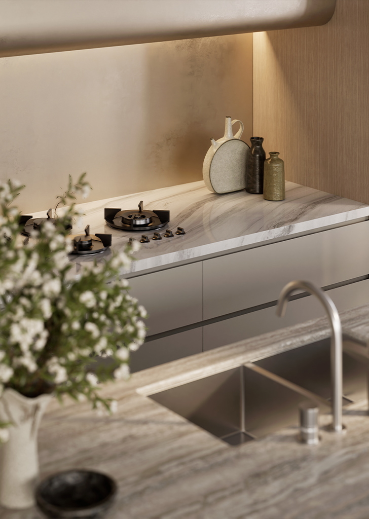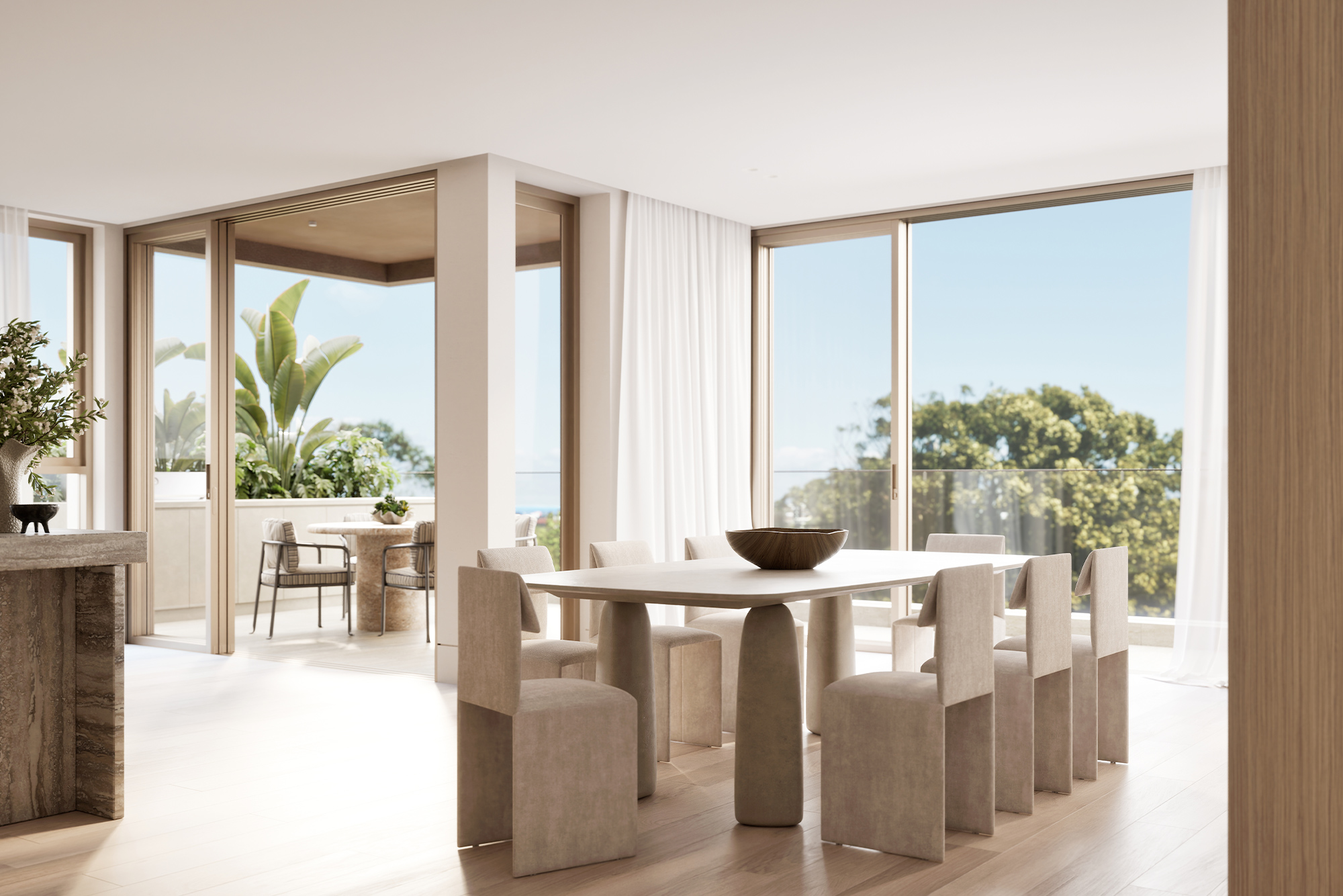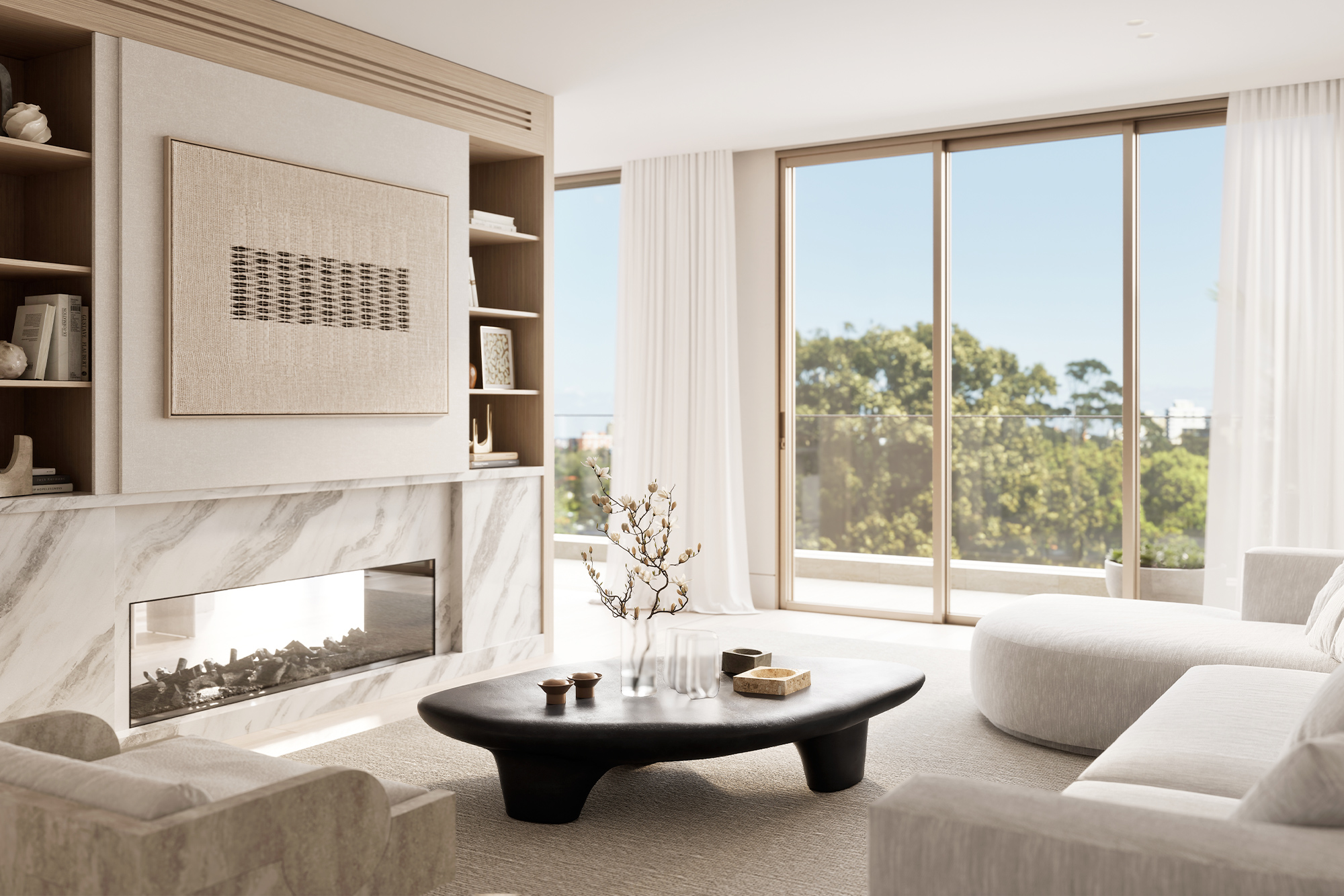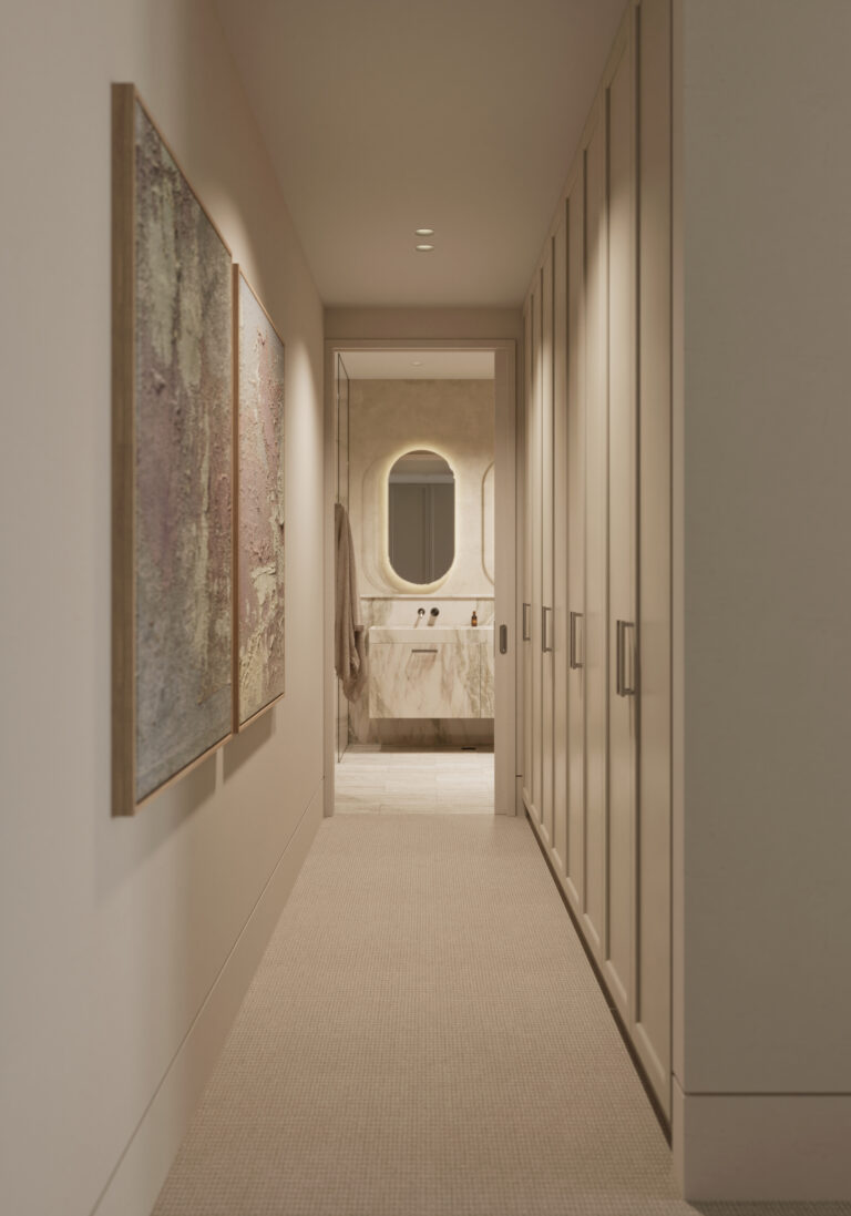 Occupying the entire top floor, the three-bedroom penthouse is a masterpiece of design and scale. Harbour views span Sydney Harbour, the Opera House and Harbour Bridge right across towards Middle Harbour. Generous open plan living and dining spaces feature a stunning double-sided fireplace as the focal point. At the centre of the home, the entertainer’s kitchen is anchored by a natural travertine stone island which flows seamlessly to a 30sqm terrace, capturing the city vistas.